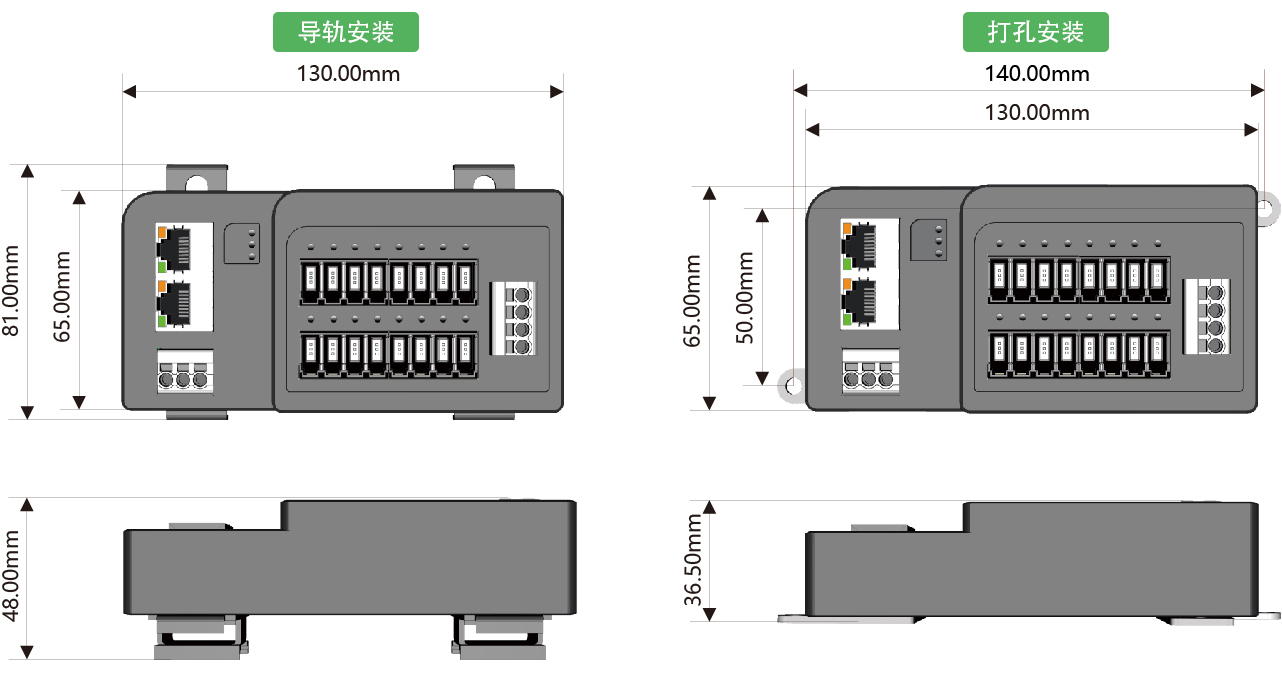 安裝方式:DIN35導軌安裝或雙側耳打孔安裝